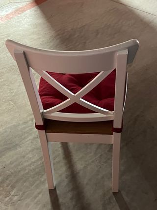 Conjunto de sillas de madera de Ikea en color blanco. Son cómodas y aportan un toque clásico a cualquier espacio. Cada una 20 euros. Coger San Juan playa. - Diseño con respaldo cruzado. - Asiento liso y confortable.