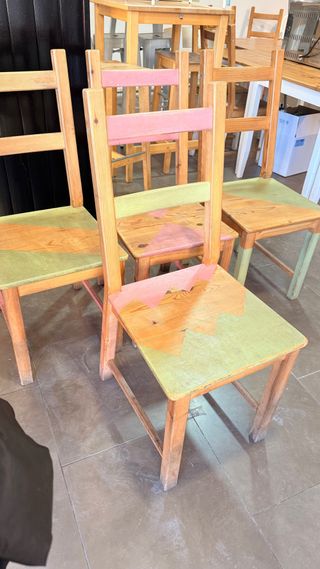 3 sillas nuevas sin estrenar acolchadas de tela y estructura de metal. 50 € 4 sillas de mimbre y estructura de madera , usadas. 50€ Otras ...y de Ikea blancas...desde 5€ según modelo o individual .