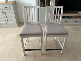 Conjunto de taburetes altos con un diseño moderno y elegante. - Estructura de metal cromado. - Asiento de plástico blanco. - Tengo 2 unidades y las vendo a 40€ cada una . Su precio actual ahora en ikea es de 69€ cada uno.