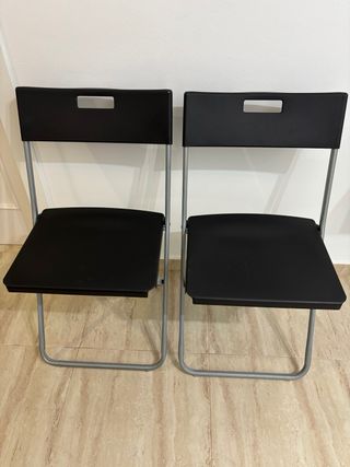 Conjunto de dos sillas plegables, perfectas para cualquier espacio. - Estructura metálica plateada. - Asiento y respaldo de plástico negro.
