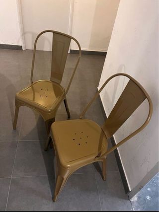 dos sillas estilo Tolix color mostaza las dos por 45€ Diseño industrial, apilables muy resistentes y en muy buen estado. Se pueden recoger en zona metro Pavones