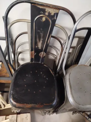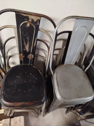 Conjunto de 44 sillas apilables, ideales para hostelería. - Diseño tipo Tolix. - Estructura metálica robusta. - Apilables para optimizar espacio. - Precio por todas 44x10=440 eur. - Precio unidad 20 eur- minimo 4 unidades.