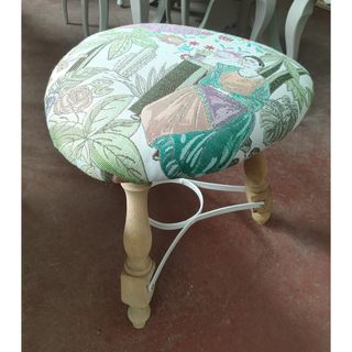 Taburete o escabel vintage restaurado. Madera decapada al natural, forja pintada en blanco y tapizado con tela de Frida Khalo. Alto 40 cm Ancho 36 cm Hay una bandeja vintage a juego tapizada con la misma tela de este taburete a la venta en nuestro perfil.