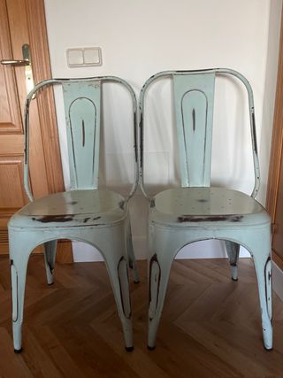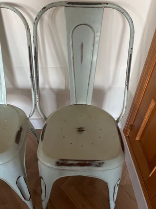Tres sillas de metal en color plata. 13€ cada una. Las tres 35€. Son ideales para darle un toque industrial a tu espacio. - Tienen un diseño sencillo y elegante. - Se encuentran en buen estado, con algunas marcas de uso que les dan un aspecto único. - Perfectas para cocina, comedor o cualquier ambiente.