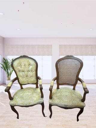 Pareja de sillas de estilo vintage. Se encuentran en buen estado. - Diseño elegante y clásico. - Tapicería de tela beige con detalles florales. - Estructura de madera marrón. -Es ideal para restauración si se quiere. 🚨El precio puesto es por las 2 sillas 🚨Precio NO negociable. Este es un perfil serio, por favor no me haga perder el tiempo....