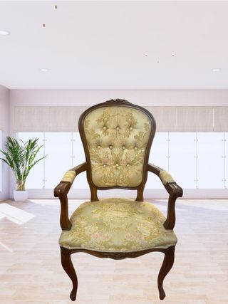 Elegante sillón de madera con un bonito estampado floral. - Diseño clásico. - Tapicería de tela con motivos florales. - Estructura de madera robusta.