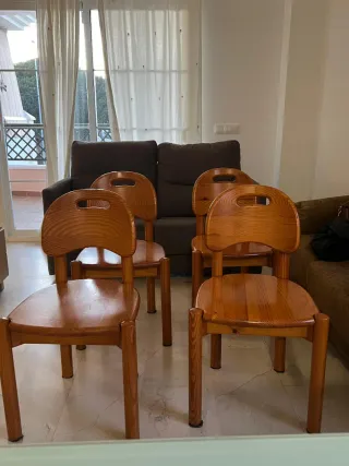 Conjunto de cuatro sillas de madera de pino con un diseño brutalista inspirado en el estilo de Rainer Daumiller. Su estructura robusta y líneas orgánicas las hacen piezas únicas. - Diseño icónico. - Acabado natural de la madera. - Vintage