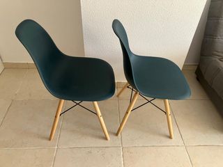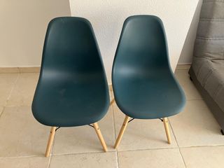 Conjunto de dos sillas de diseño moderno con un atractivo color azul verdoso. A una silla le falta un tornillo.