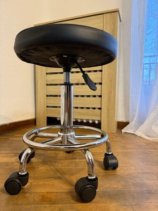 Taburete con asiento redondo y base de ruedas. - Asiento acolchado. - Base cromada. - Ruedas para fácil movilidad.
