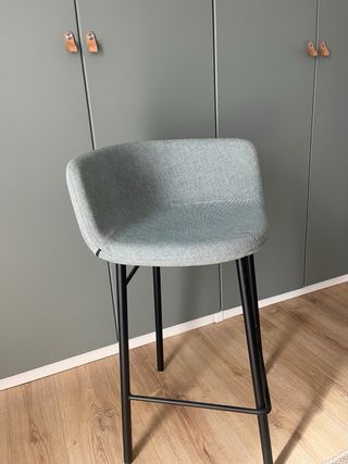 Preciosa silla de bar AKABA, en perfecto estado. Es de color verde azulado y tiene una estructura metálica. - Asiento cómodo y tapizado. - Patas resistentes y elegantes. - Ideal para cocina o barra. Precio original 554€ Negociable
