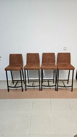 Taburetes acolchado marrón imitación de cuero, patas metálicas negras. Combinan con las sillas de hojas del pack de sillas acolchadas.