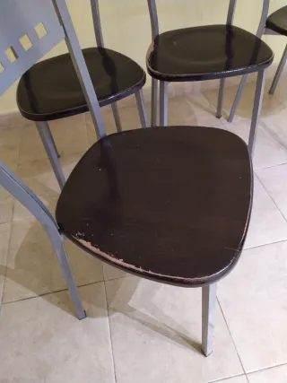 Se venden cuatro sillas con un diseño moderno y funcional. - Estructura de metal - Asiento y respaldo de madera. - Combinación de colores marrón y gris. -Presentan signos de desgaste en la madera, en muy buen Estado salvó una que el respaldo está despegada la soldadura pero que no afecta en absoluto a la utilidad de la silla por la robustez de su estructura principal. El precio es por todo el conjunto.