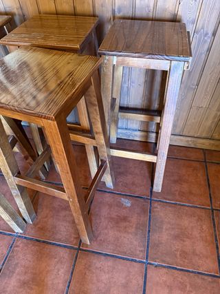 Se venden cinco taburetes de madera. Son robustos y están en buen estado, aunque muestran señales normales de uso. - Ideales para cocina o bar. - Listos para usar. - Se venden juntos.