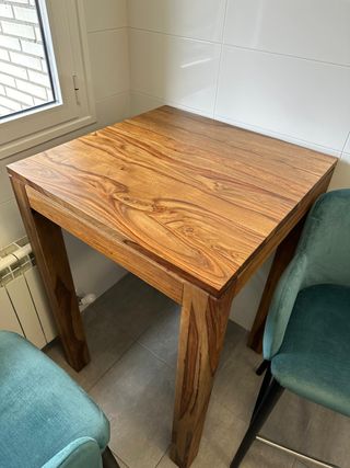 Conjunto de mesa alta de madera maciza con dos taburetes. - Mesa de comedor alta. - Dos taburetes con asiento y respaldo tapizados. Palabras clave: Maison du Monde, Sklum, Ikea, Tikamoon, Decogood, Jysc