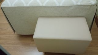 Taburete pied de cama, revestimiento en polipiel , y base de cuatro patas de madera Seminuevo Medidas , alto 47cm Ancho 31 cm Largo 54 cm Taburete Marca tapizados carrasco