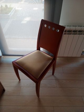 Se venden tres taburetes apilables. Son de madera color marrón con asiento de piel sintética beige. Están en buen estado. - Apilables para ahorrar espacio. - Madera resistente. - Asientos acolchados.