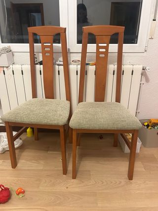 Conjunto de dos sillas con un diseño elegante y asiento confortable. - Estructura de madera resistente. - Asiento tapizado en tela de color verde.