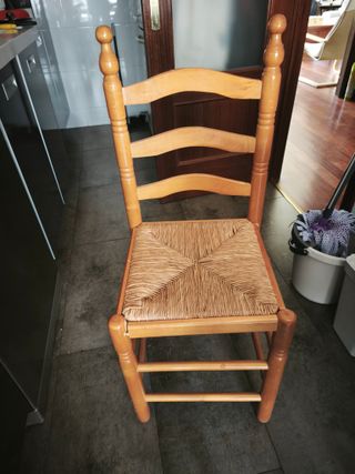 Conjunto de cuatro sillas de madera, perfectas para tu cocina o comedor. Su diseño rústico aporta calidez a cualquier espacio. - Asiento tejido. - Patas y respaldo de madera.