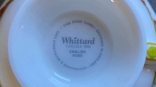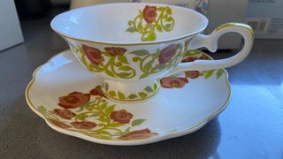 Preciosa taza de té con su platillo a juego, decorada con un delicado diseño de rosas y hojas en tonos rosados y verdes. - Diseño floral clásico. - Borde dorado. - Ideal para coleccionistas o para disfrutar de una taza de té especial.