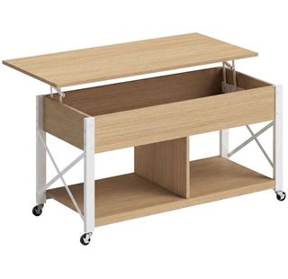 Mesa de centro con diseño moderno y funcional. Su tapa elevable permite adaptarla a diferentes usos. - Estructura de metal resistente. - Acabado en madera clara. - Ruedas para fácil movilidad.