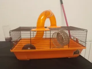 Jaula para hámster con varios accesorios incluidos para el entretenimiento de tu mascota. - Tubo de conexión naranja. - Rueda de ejercicio (es muy silenciosa) - Bebedero. - Comedero.