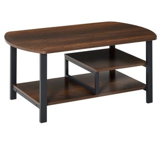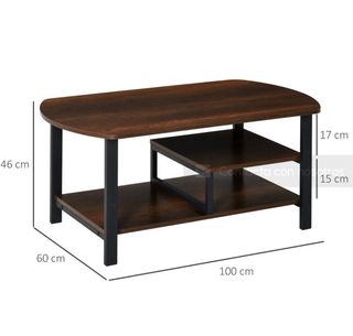 Mesa de centro con un diseño moderno y funcional. - Tablero de madera con acabado oscuro. - Patas y estructura de metal negro. - Dos estantes inferiores para almacenamiento.