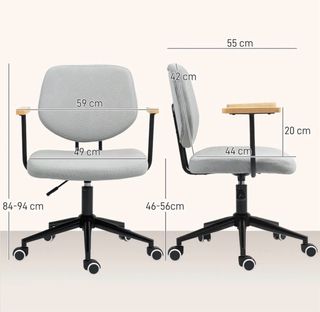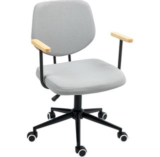 Silla de oficina con un diseño moderno y cómodo. - Tapicería de tela en color gris. - Reposabrazos con acabado en madera. - Base metálica con ruedas.