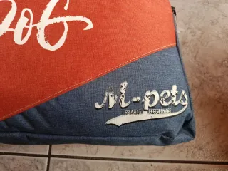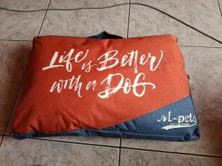 Cojín decorativo para mascotas con un mensaje inspirador. - Diseño con la frase Life is Better with a Dog. - Combinación de colores naranja y azul. - Detalle del logo M-pets en la parte inferior.