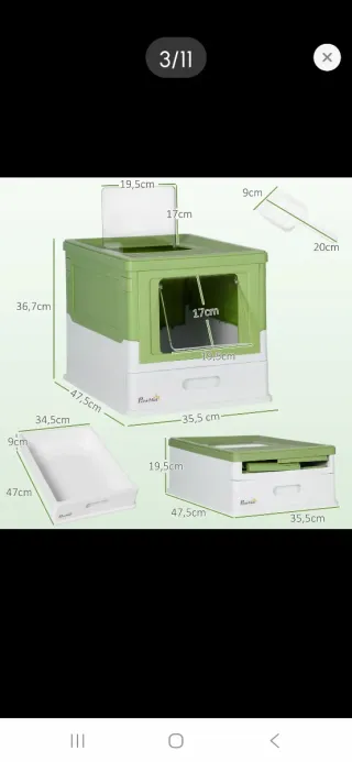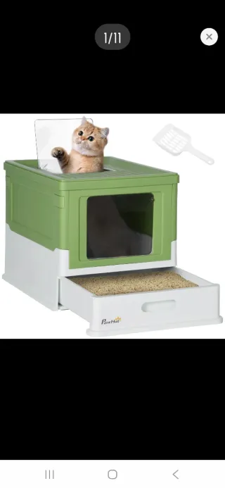 Arenero para gatos de diseño moderno y funcional, con cajón extraíble para facilitar la limpieza y pala incluida. - Color verde y blanco. - Ventana lateral para ventilación. - Pala con diseño calado.