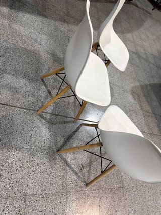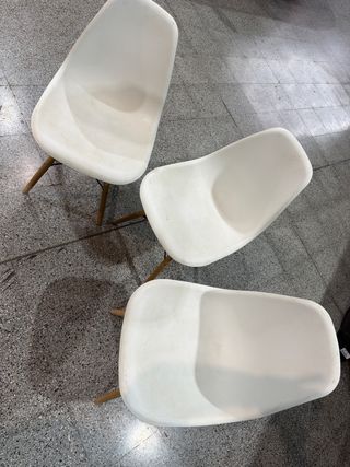 Conjunto de tres sillas modernas, perfectas para tu comedor o cocina. Su diseño escandinavo aporta un toque de estilo. - mordidas las patas por el perro. - Asiento ergonómico. - Patas de madera. - Materiales resistentes.