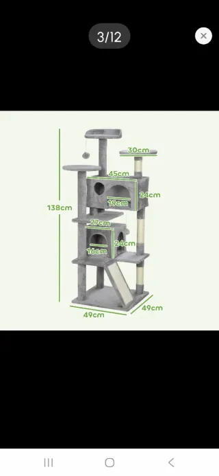 Este rascador para gatos ofrece múltiples niveles y áreas de descanso. - Plataformas acolchadas para mayor comodidad. - Casa para que el gato se esconda y descanse. - Escalera para facilitar el acceso a los diferentes niveles. - Postes cubiertos de sisal para afilar las uñas.