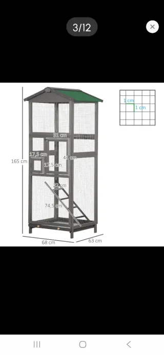 Jaula espaciosa para pájaros, con un diseño de madera resistente y techo a dos aguas. - Estructura de madera. - Techo verde. - Múltiples niveles y acceso. - Incluye rampas.