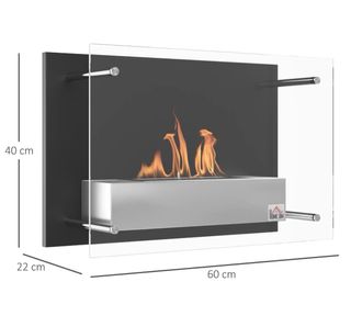 Elegante chimenea de bioetanol con un diseño contemporáneo. - Panel trasero en acabado negro. - Quemador y soportes en acabado plateado. - Panel frontal de cristal. - Montaje en pared.