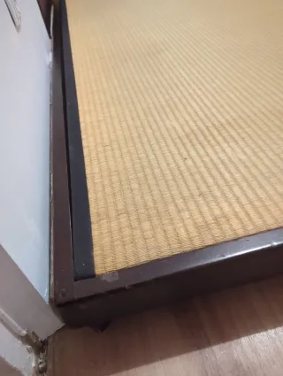 Tatami Base de cama baja de madera estilo japonés con diseño elegante y natural de color beige y marrón. Se vende la base y el tatami de bambú, con la estructura de madera. A recoger en barrio de Montecarmelo. Medidas: Ancho 1,89 m, profundidad 2,09 cm, Alto 0,21 cm Vale para colchones de hasta 1'80 cm ancho y 200 cm largo. Los tatamis tienen la sombra del colchon por el sol que seca la parte de fuera, pero estan en muy buen estado.