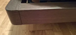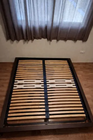 Estructura de cama estilo tatami con somier de láminas. - Marco exterior de madera oscura. - Base de somier con láminas de madera. - Soportes centrales de metal. Seria para recoger en domicilio.