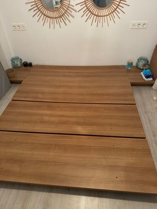 Tatami ,base de cama estilo japones en buen estado 1,76 de largo por 1,40 de ancho Tiene las patas para levantar la zona de la cabeza Se entrega desmontado en 3 partes Urge venta - Fabricada en madera. - Color natural de la madera.