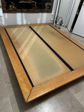 Cama de matrimonio estilo japonés tatami y mesita a juego. Está en buen estado. Estructura de madera maciza con lamas y suelo tradicional japonés de caña de arroz prensada. Una base sólida, de tacto agradable y estética cálida, elaborada con fibras 100% naturales. Permite una perfecta transpiración del colchón, es un excelente aislante y constituye una solución idónea para montar sobre tarimas de madera. Compuesto de una sólida plataforma de caña de arroz prensada, cosida y recubierta por una esterilla de mimbre y dos franjas laterales de un tejido de algodón y nylon muy resistente. Para colchon de 150x200 Sin colchon.