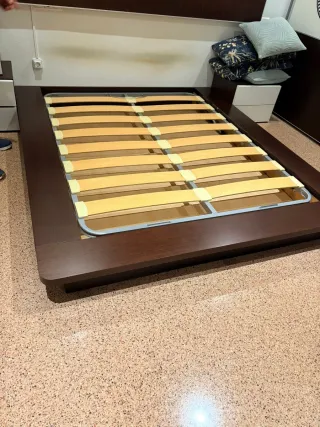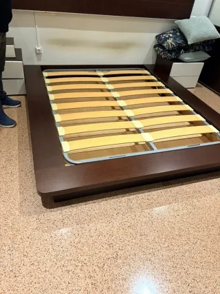 CAMA TATAMI JAPONES. Color Vengue muy robusta y de calidad. Altura 13,5 cm total. Ancho de la base del colchón y cabecero principal 165 cm (ideal colchón. De 135cm ò 150 cm. Total de ancho con ampliación de cabecero 390 cm (lleva una ampliación por cada lado de la estructura anclada con unas pletinas de aluminio) largo 196,5 cm (colchón 190cm) Alto total del cabecero 55cm. Vigas centrales. 3kg x 2 Extensión de acero 8,1kg x 2 Cabecero 21,7 kg Estructura principal 44 kg x 2 Total kgms 132kg+tornillería y 2 placas de aluminio de unión cabecero. No hago envíos de este artículo Ayudo a cargarlo. Me costó 770€ con mesitas y sinfonier