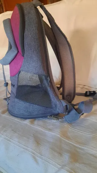 Mochila de transporte para perros pequeños o cachorros, con un diseño moderno y funcional. - Abertura superior para que el animal pueda sacar la cabeza. - Paneles de malla para ventilación. - Cierre de cremallera y cordón ajustable. Medidas : ancho 28 cm Altura 38 cm Profundidad 19 cm. No se hacen envíos -