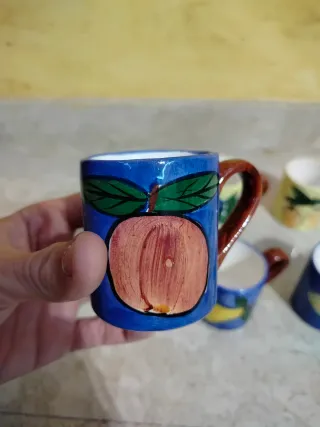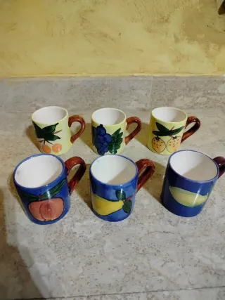 Conjunto de seis tazas de cerámica decoradas con motivos frutales. - Diseño de cerezas en fondo amarillo. - Diseño de uvas en fondo amarillo. - Diseño de melocotones en fondo amarillo. - Diseño de manzana en fondo azul. - Diseño de pera en fondo azul. - Diseño de limón en fondo azul.