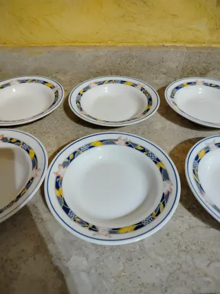 Set de seis platos pequeños y hondos, perfectos para servir aperitivos o tapas. Su diseño es elegante y versátil. - Borde decorado con motivos azules y amarillos. - Ideales para aperitivos y postres.