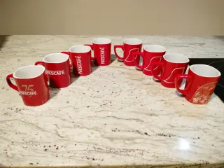 Tazas nescafé. -Tres lisas en color rojo con letras en blanco. -Tres rojas con letras y círculos en blanco. -Tres rojas con dibujo de atardecer por un lado y de una mujer por el otro. Estas vienen con caja. Las vendo individualmente a 3€ la unidad. Háblame y miramos.