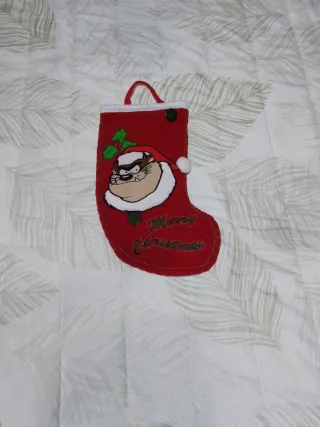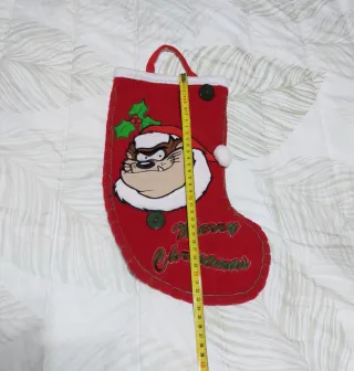 Calcetín grande de Navidad con diseño de Taz de Looney Tunes. - Decorado con un gorro de Papá Noel y acebo. - Lleva bordado Merry Christmas en la parte delantera. - Cierre superior con borde blanco y pompón. - Dos botones decorativos en la parte frontal.