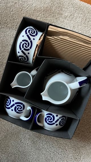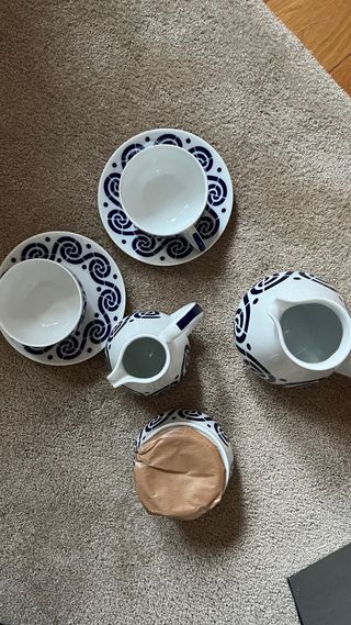 Le falta dos tazas y el mango de otra. Tiene cafetera,lechera y azucarero.