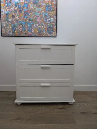 Cómoda de tres cajones con un diseño clásico y elegante. - Acabado en blanco. - Tiradores integrados en cada cajón. - Patas redondeadas para un soporte estable.