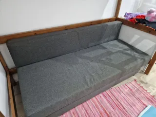 Este sofá cama combina un diseño moderno con la calidez de la madera. - Tapicería de tela en color gris. - Estructura de madera robusta.