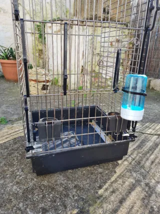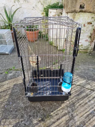 Jaula para pájaros o loros, con base negra y accesorios. - 2 Comedero. - Posadero. - Y otro posadero para la parte de arriba que se abre incluido, (no sale en las imágenes. - Tiene la basd un poco agrietada pero hace su función perfectamente, nueva costo 120€.