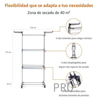 Tendedero de pie con tres niveles para secar la ropa. - Estructura plegable para un fácil almacenamiento. - Ruedas para moverlo cómodamente. - Barras resistentes para colgar prendas.