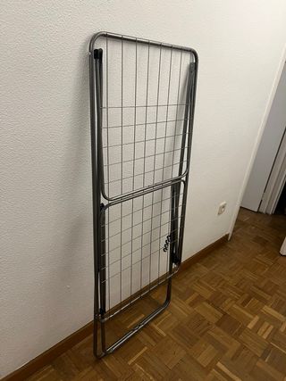 Tendedero plegable de metal y plástico. - Estructura resistente. - Fácil de guardar. Una de las alas está un poco vencida pero se puede usar igualmente y tiene un poco saltada la pintura.