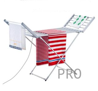 Tendedero plegable con estructura metálica y detalles en plástico. - Diseño práctico y fácil de guardar. - Ideal para secar ropa en interiores o exteriores.